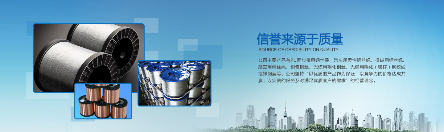 公司主要產(chǎn)品有PU同步帶用鋼絲繩、汽車用柔性鋼絲繩、操縱用鋼絲繩、航空用鋼絲繩、銅包鋼絲、光纜用磷化鋼絲、光纜用磷化(鍍鋅)鋼絞線、鍍鋅鋼絲等。經(jīng)過多年的研究、摸索、開發(fā),公司已形成了完整的技術(shù)、工藝軟件,產(chǎn)品實物質(zhì)量均達(dá)到國際先進(jìn)水平。